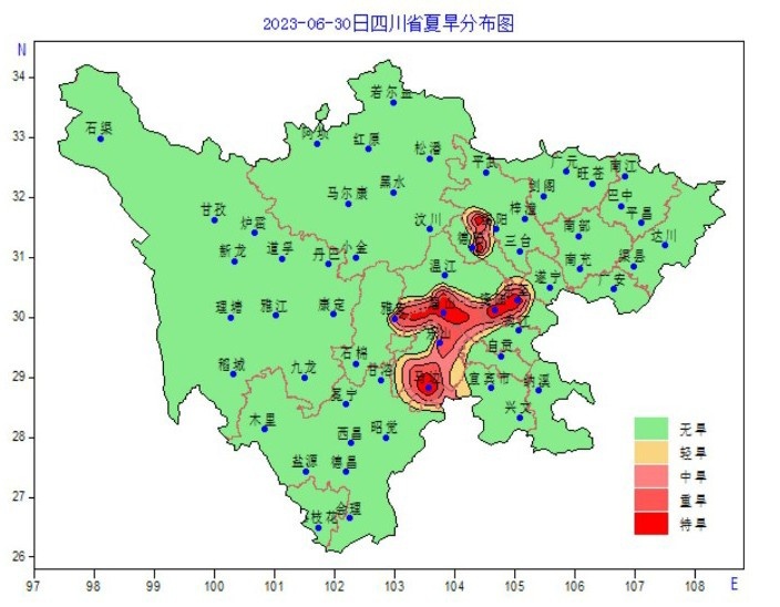 目前,盆西北、盆西南部分地区旱情持续,局地偏重。据四川省气象干旱指标监测,截至6月30日,全省有21县站出现夏旱,其中轻旱1站、中旱2站、重旱3站、特旱15站,其中重、特旱主要出现在盆中和盆西南等地,局地旱情偏重。