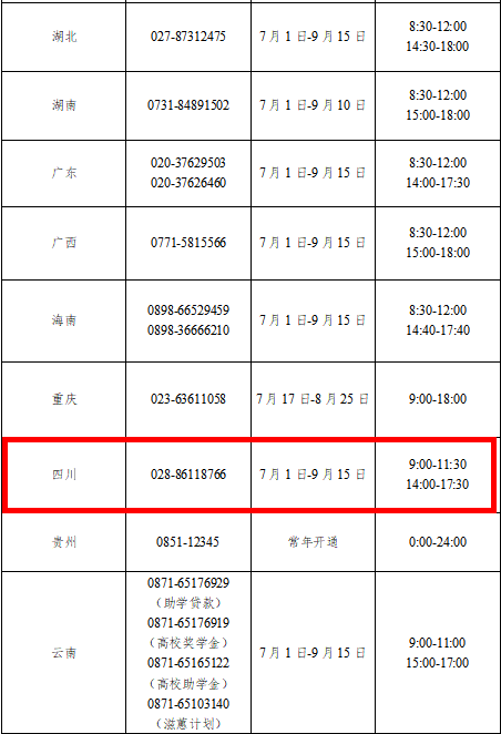 同时,各地学生资助热线电话也陆续开通,四川为028-86118766。泸州学生可于7月1日至9月15日期间,拨打该热线咨询,受理时段为9:00-11:30、14:00-17:30。